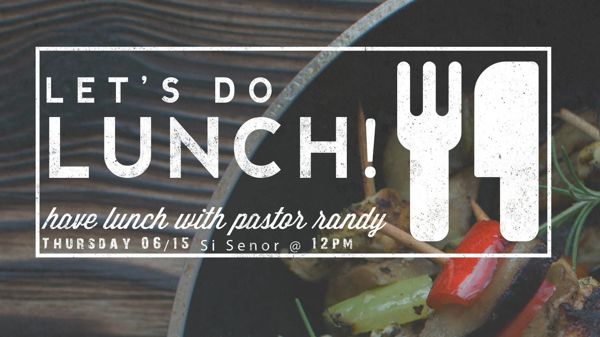 ✚ gCal ✚ iCal Let's Do LunchOnce a month you are invited to join Pastor Randy for lunch at a local restaurant. Our next lunch is at 12:00pm on Thursday, June 15th at Si Senor.Sign up here.