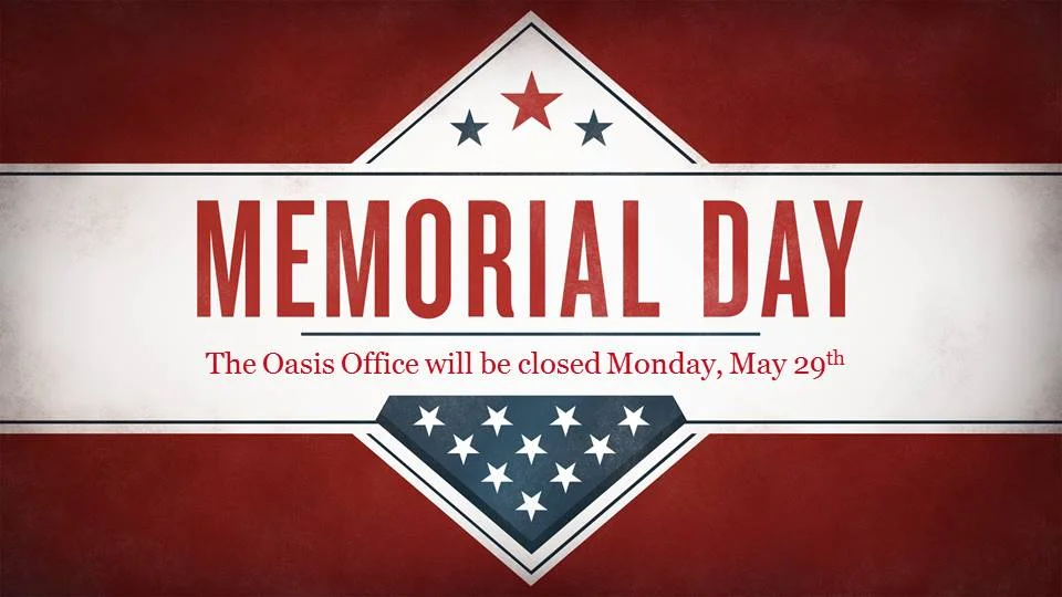 ✚ gCal ✚ iCal Memorial DayThe Oasis office will be closed Monday, May 29th in observance of Memorial Day. Regular office hours will resume on Tuesday, May 30th.